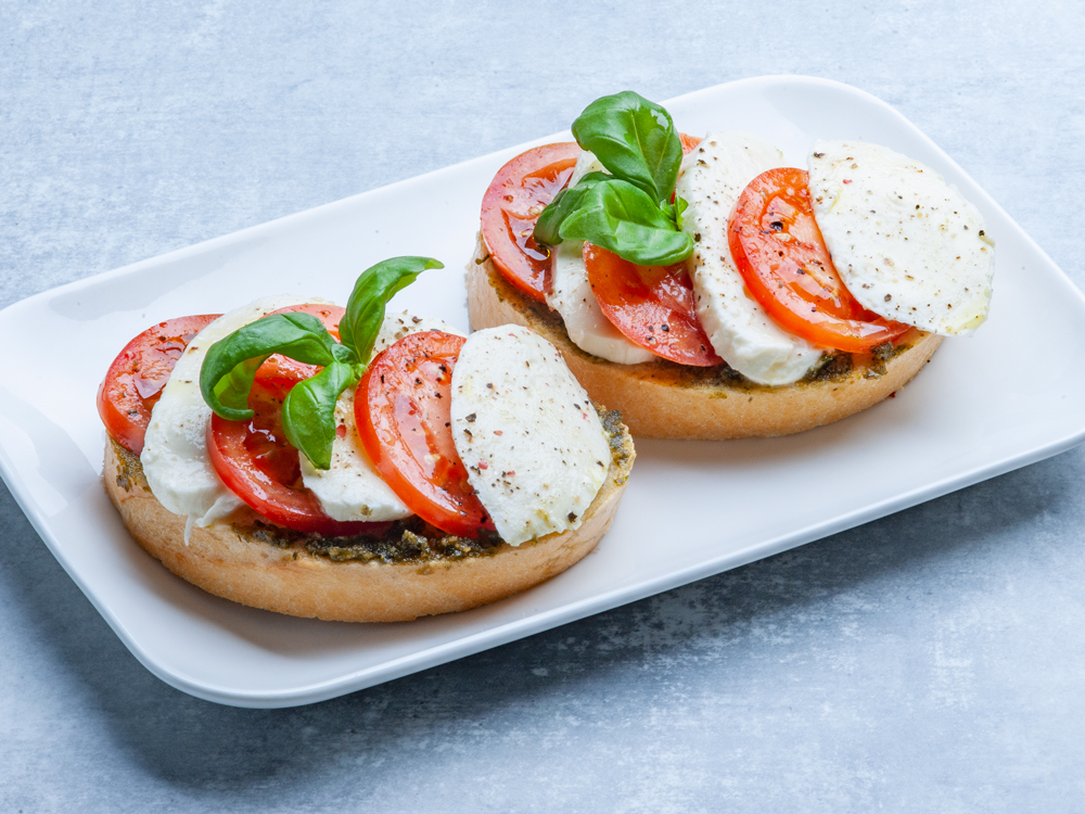 Chlebíček s bazalkovým pestem, mozzarellou a rajčaty.