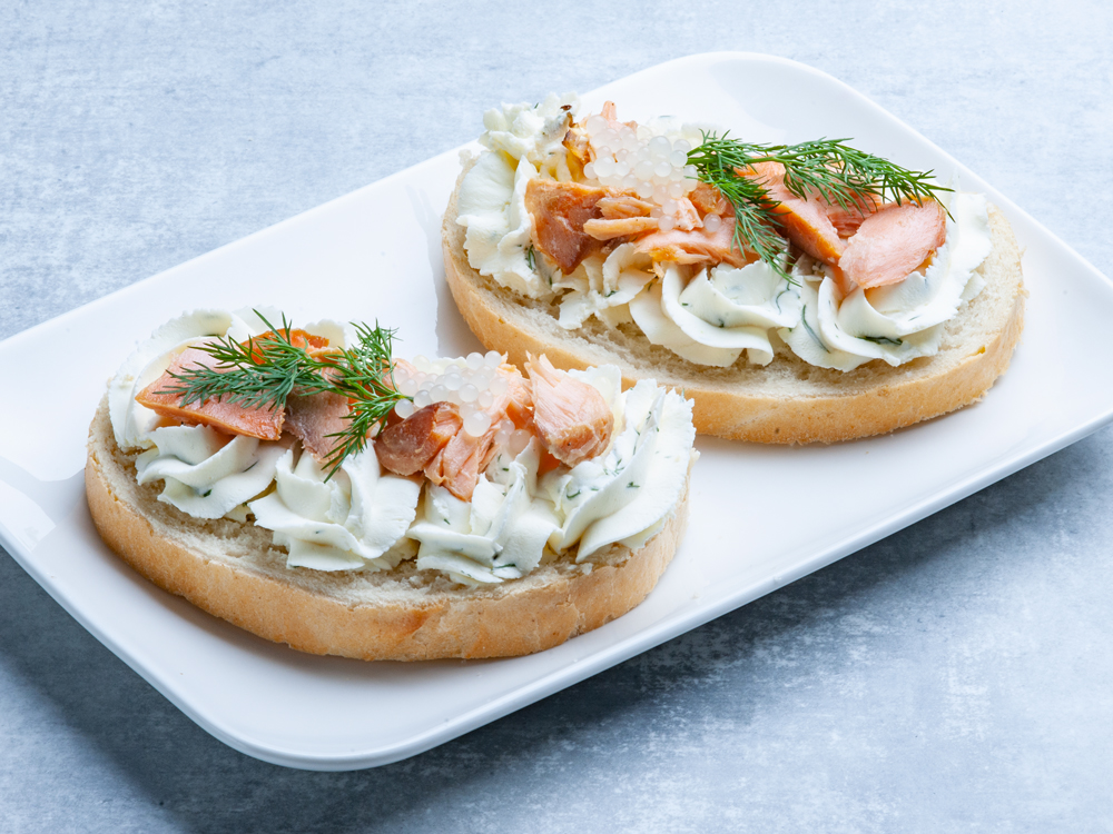 Chlebíček s domácí lučinou a domácím uzeným lososem, citrónový kaviár.