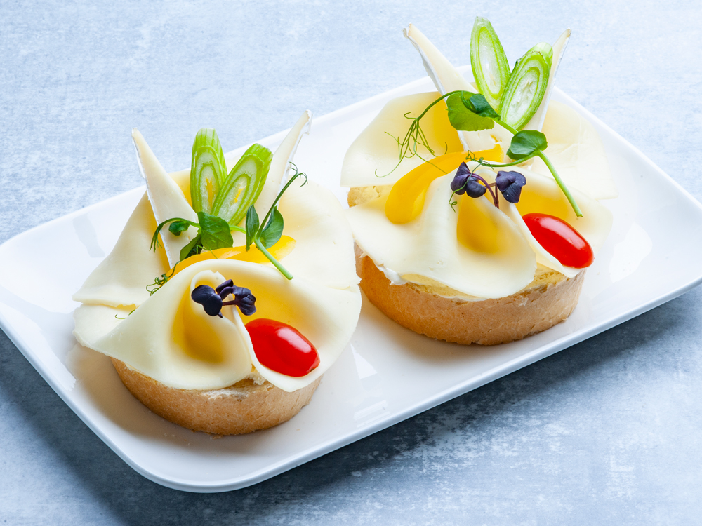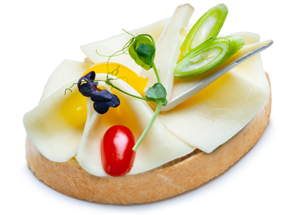 Chlebíček s plátky eidam sýru a kousky hermelínu.