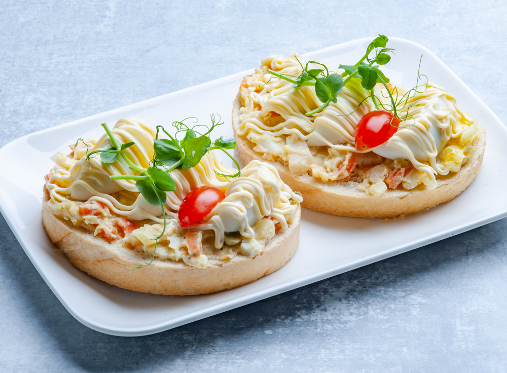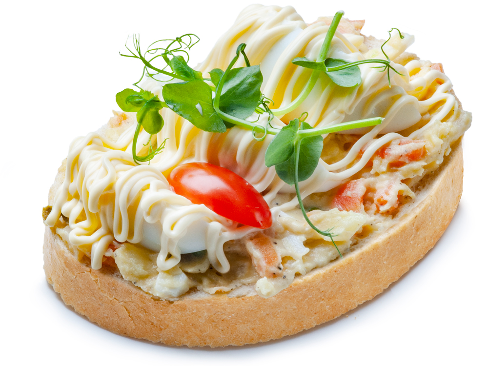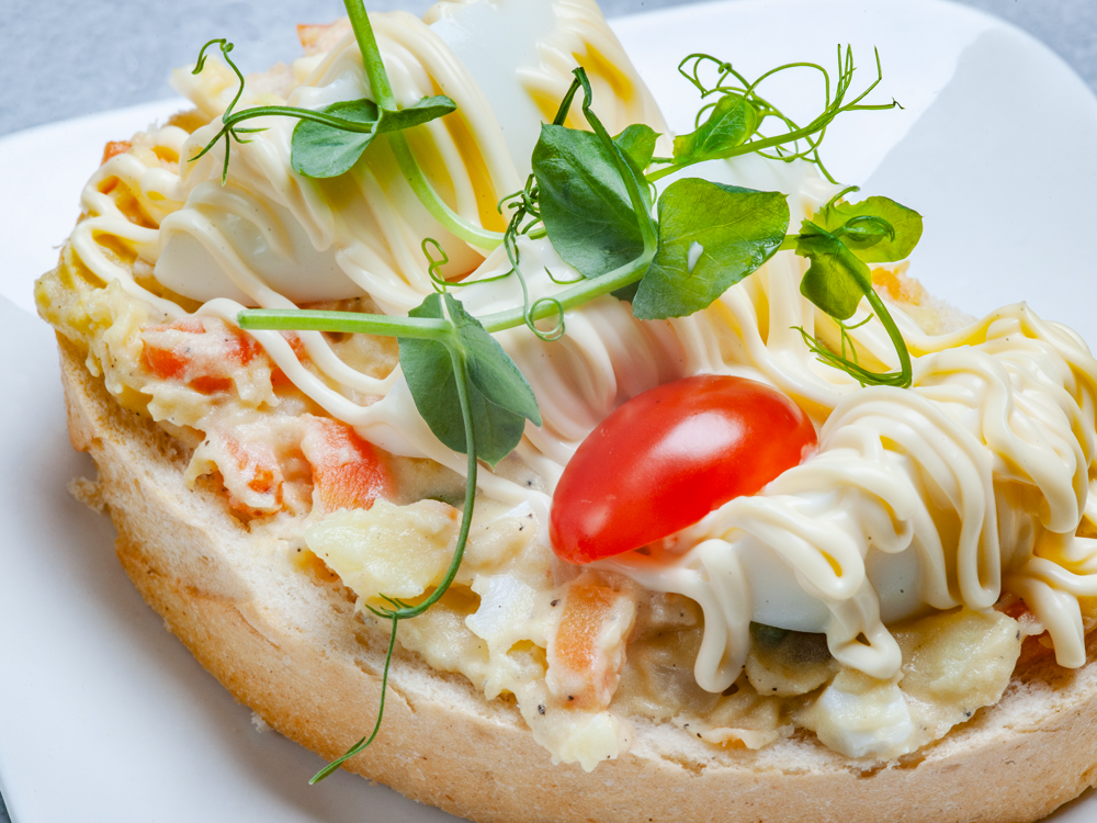 Chlebíček na bramborovém salátu s vejcem a majonézovým přelivem.