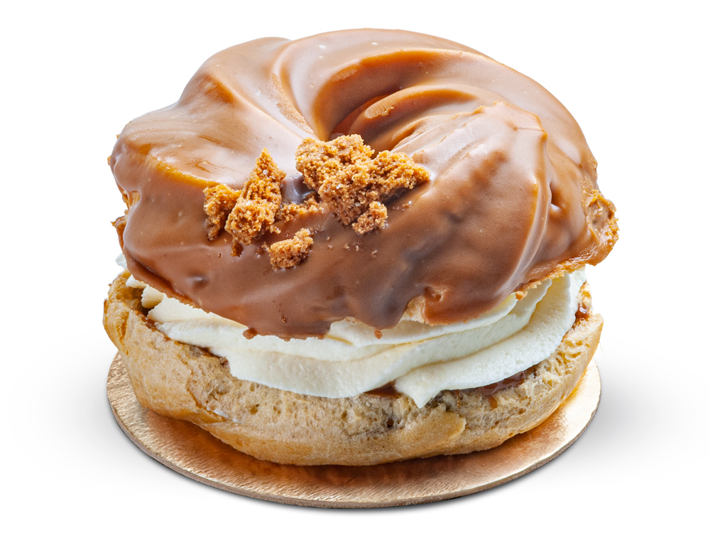Věneček plněný křupinkami, smetanovým krémem, politý karamelovou polevou.