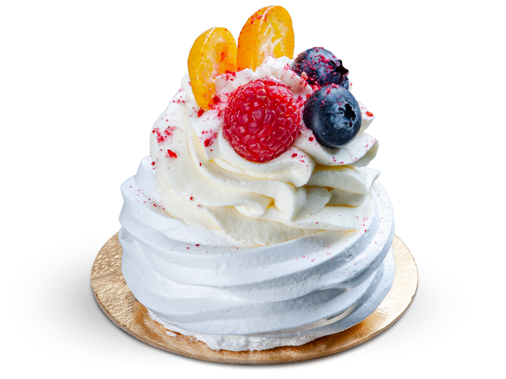 Křehký bílkový korpus s ovocným pyré a krémem s mascarpone, zdobený sezónním ovocem.